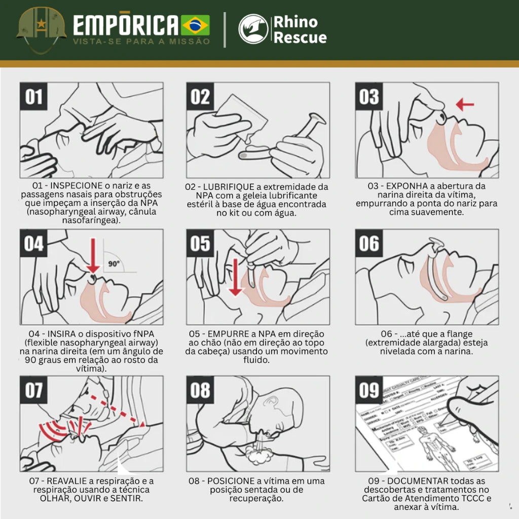1️⃣ - Cânula Nasofaríngea Rhino Rescue: tubo macio de PVC, livre de látex, projetado para fornecer uma via aérea alternativa eficaz em situações de emergência, especialmente quando a via orofaríngea está obstruída. Indicada para uso em pacientes adultos, deve ser evitada em casos de trauma facial ou craniano. Além disso, pode auxiliar na aspiração das vias aéreas, permitindo a remoção de sangue, vômito e outros materiais obstrutivos.